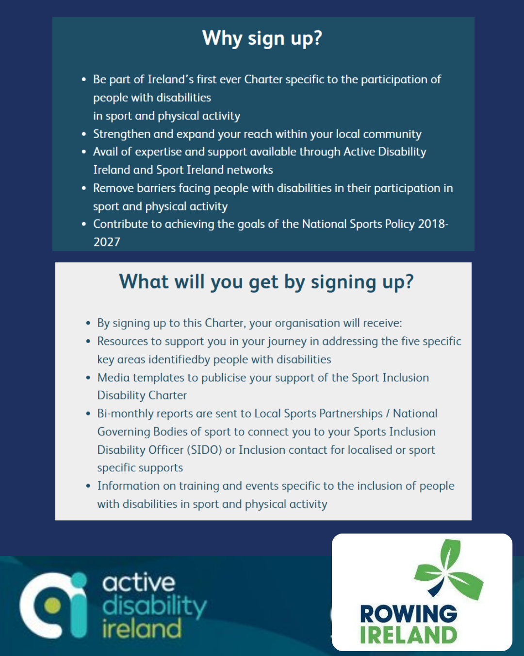 Along with Rowing Ireland as an NGB, 21 of our clubs nationwide have already independently signed up showing a commitment to removing barriers facing people with disabilities in their club!